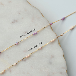 These particular styles feature our elongated rolo chain (fits 24/22 gauge jump ring) and and a choice of Coral or Purple Opal on 14k Gold Fill chain.