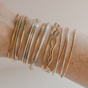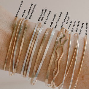 Choose from hammered with texture, hammered flat but smooth, round, wavy or with "sparkle" wire (a hammered option and non-hammered)- Keep in mind, Sparkle is only available in Gold Fill and Rose Gold is only available in the "Thin" bangle options!