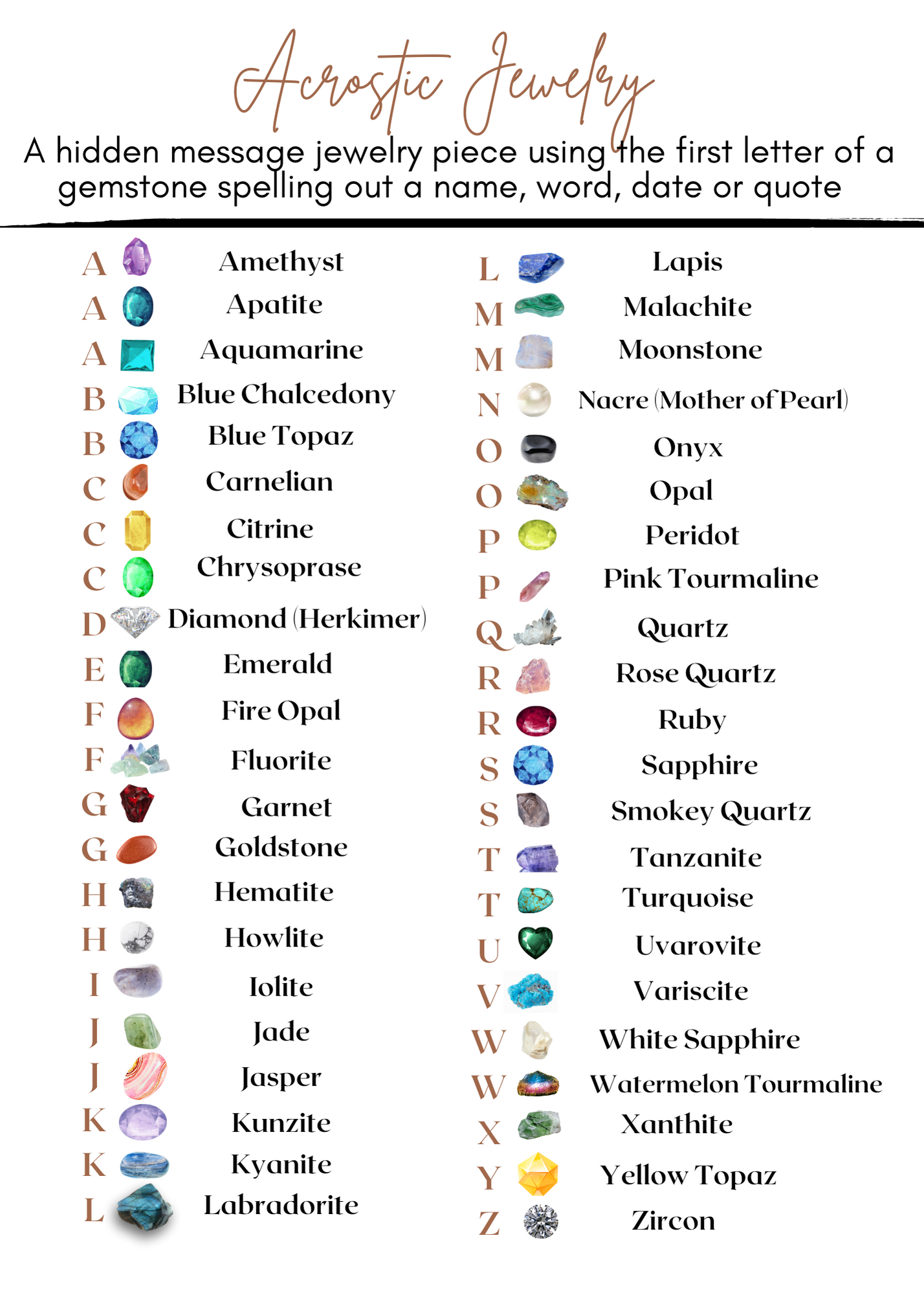 Hidden Message (Acrostic) jewelry is messages spelt out with gemstones. The first letter of a gemstone's name is used to spell out a word, date, name or quote!