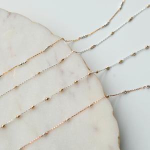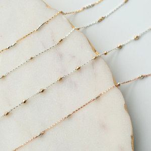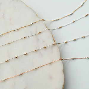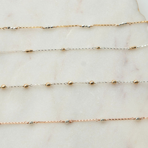 These particular styles feature our elongated rolo chain (fits 24/22 gauge jump ring) and a choice of different sizes of faceted 14k Gold Fill and Sterling Silver beads - all mixed metal magic!