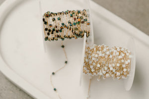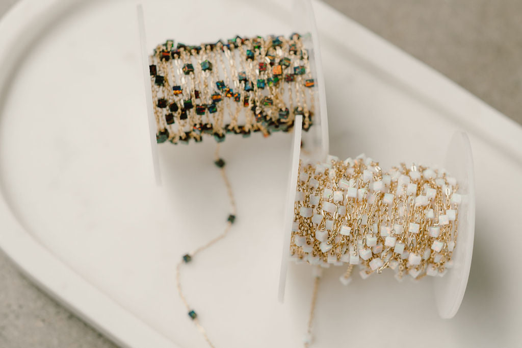 14k Gold Fill and Sterling Silver opal permanent jewelry chains sold in 3 foot (1 yard) increments! Tons of 3mm opal cubes with about 13 connectors per foot which is about stones! This style is definitely my best-seller for my PJ biz!