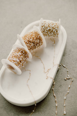 14k Gold Fill and Sterling Silver opal permanent jewelry chains sold in 3 foot (1 yard) increments! Tons of 3mm opals with about 17 connectors per foot which is about 24 stones! This style is definitely my best-seller for my PJ biz!