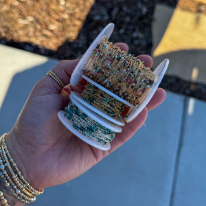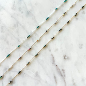 These chains are handcrafted with tiny 2mm gemstone beads. From Left to right- apatite, middle is mixed gem and left is African Turquoise! These are darling and the tiny gemstones have been selling more than the 3mm versions ...especially the mixed gem!