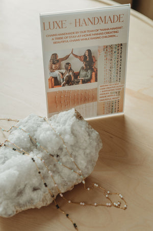All chains are HANDMADE by our team of mama makers! (Our tribe of stay-at-home mamas that create as a form of self-care and a way to support their families!) … If this is your first order with us for chains, we will ship a sign to display along with these chains to explain how they are made and how special they are!