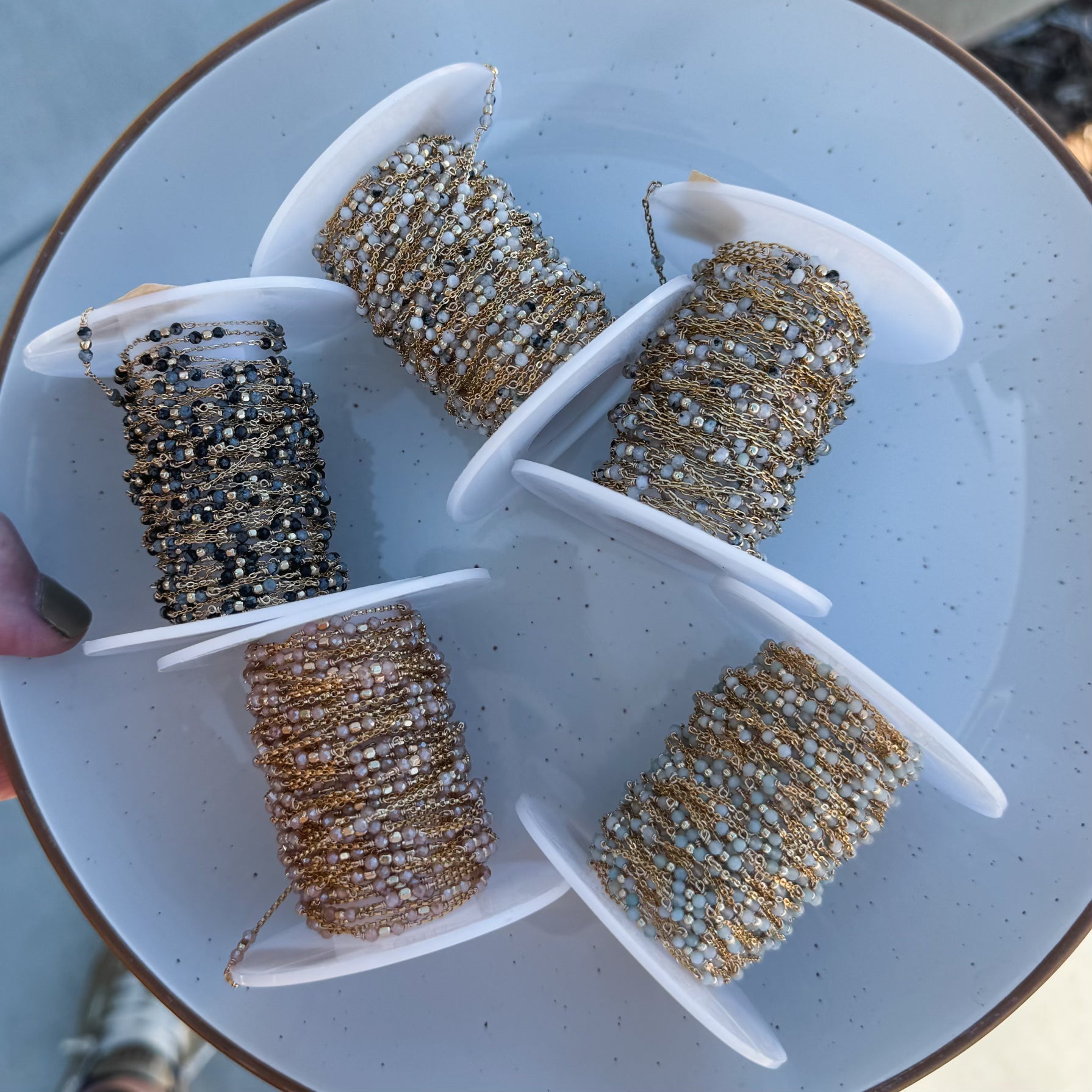 All chains are sold in 1 yard (3 foot) increments and made with 14k gold fill or sterling silver! All genuine gemstones or real pearls…This particular delicate chain requires a 26 gauge jump ring (expect for the chain on the right with paperclip chain can use 24 gauge!)