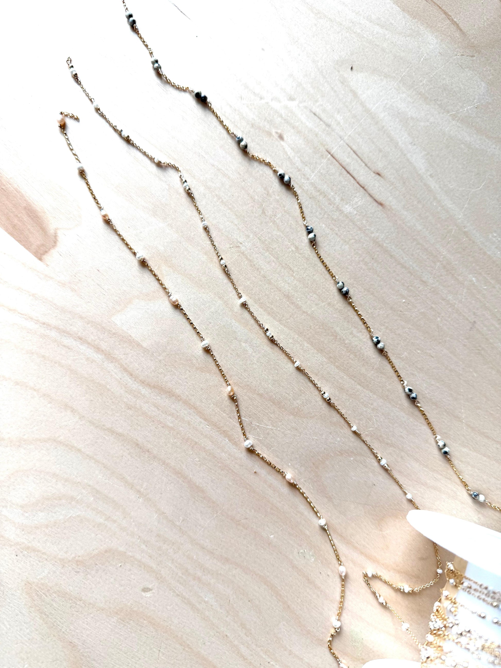 Dalmatian Jasper is made with an elongated rolo chain that you can use a 24 gauge jump ring, Tiny pearl is a flat durable cable chain (26 gauge jump ring) and the Oval Pearl is a flat paperclip which you can use a 24 gauge jump ring!