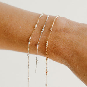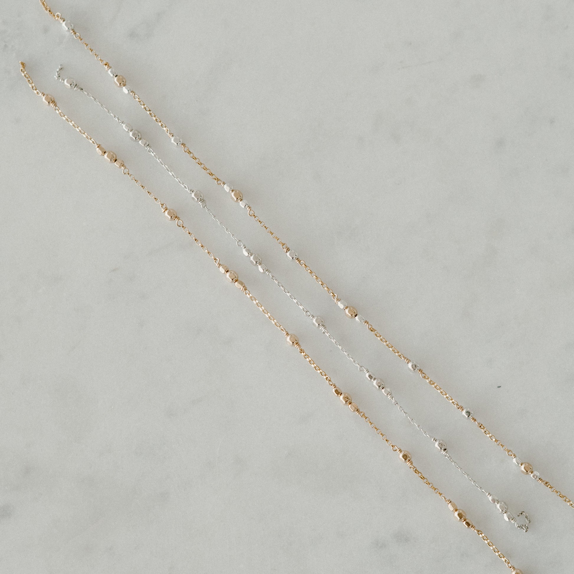 14k Gold Fill, Sterling Silver and 14k Rose Gold Fill permanent jewelry chains sold in 3 foot (1 yard) increments! Tons of 2 and 3mm faceted beads with about 15 connectors per foot! The faceted beads bring a little sparkle and catch the light so beautifully! This is handmade and adds something so special and unique to your chain line-up!