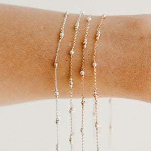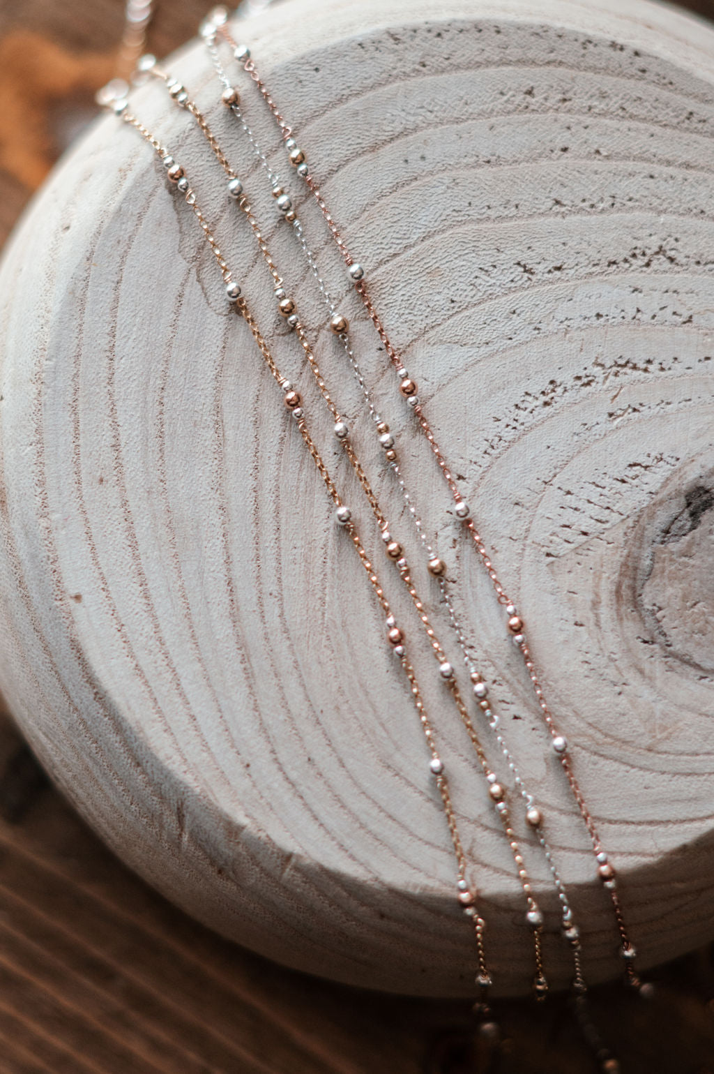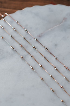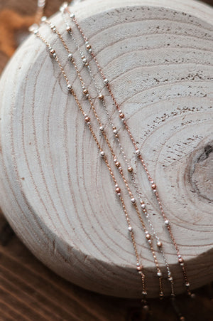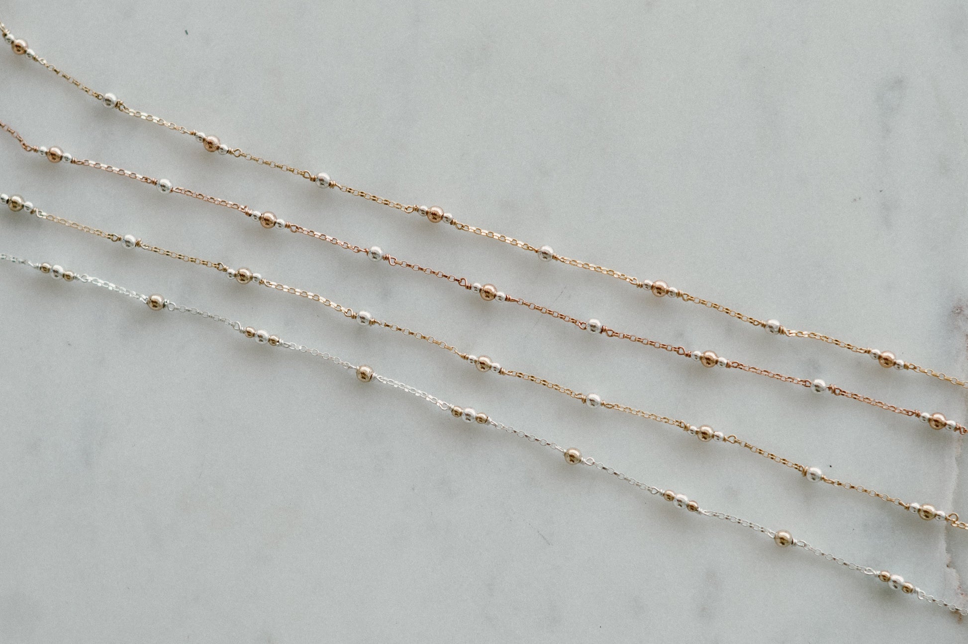 14k Gold Fill, Sterling Silver and 14k Rose Gold Fill permanent jewelry chains sold in 3 foot (1 yard) increments! Tons of 3mm beads with about 15-17 connectors per foot! This handmade chain is my one of my best sellers and currently have it as a necklace! The beads alternate in metals making all of these mixed metal chains and the ONLY chain we stock that has all 3 metals in one chain!